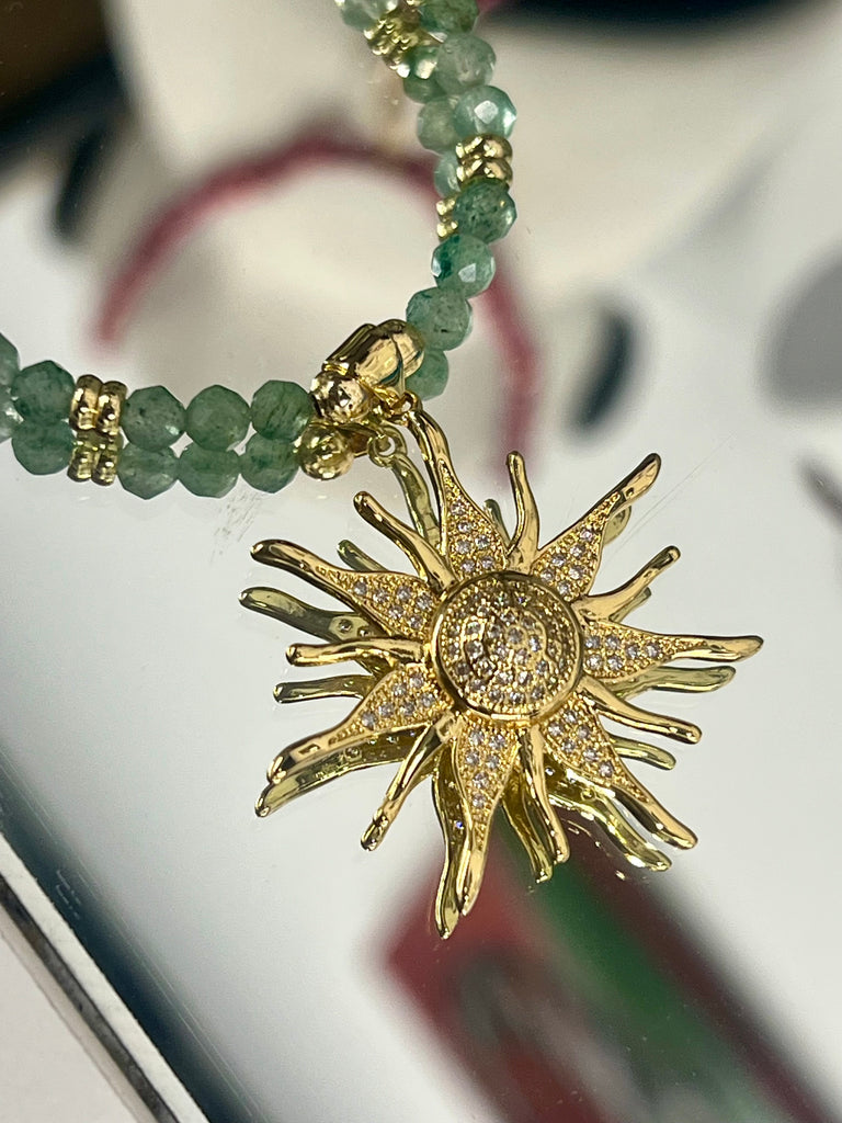 Natural Lepidocrocite Green Gemstone Grade AAA Micro Faceted 16 inches long with 2 inch extension beautiful necklace with a stainless steel 18k gold covered brazing sun pendant